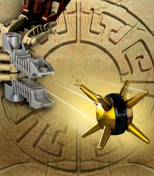 Piraka was a double-sided weapon which could be flipped. 8903 Zaktan, for an example, featured a secondary weapon with a three-bladed scissor on the one and pincers on the other side. Their canisters were bullet grey with a screwable lid. The lid contained the light-up eyepiece and it had to be taken out before it could be built with. There was also a plastic mold of the respective Piraka head, which in turn could also be removed from the lid, although it wasn't compatible to any TECHNIC piece. Additionally, these were the first large BIONICLE figures not to use gears to move their arms.